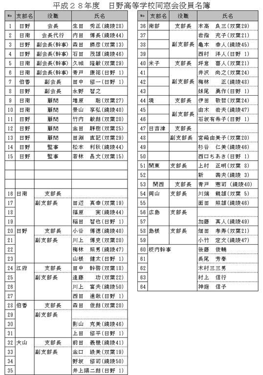 平成28年度 日野高等学校同窓会役員一覧